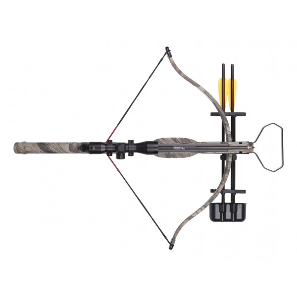 | Accessoires | 3 traits alu 16″, carquois, lunette 4×32, armeur manuel, lubrifiant à rail |