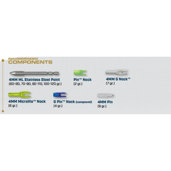 GPI | OD (in) | Longueur (in) | POINTE 4 mm ML | PIN | NOCK COLLAR | |||