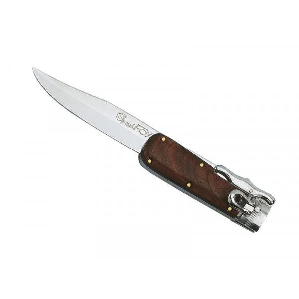 - Poignard pliant FOX, lame acier inox (ouverture et fermeture commandées par le levier poussoir), manche palissandre, étui cuir.