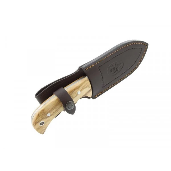 • Poignard MUELA « BISONTE », lame Ă  dĂ©pouiller 11 cm acier inox X50CrMoV15, manche olivier, Ă©tui cuir.