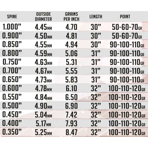 | SPINE | OUTSIDE DIAMETER | GRAIN PER INCH | LENGTH | RECOMMENDED POINT |